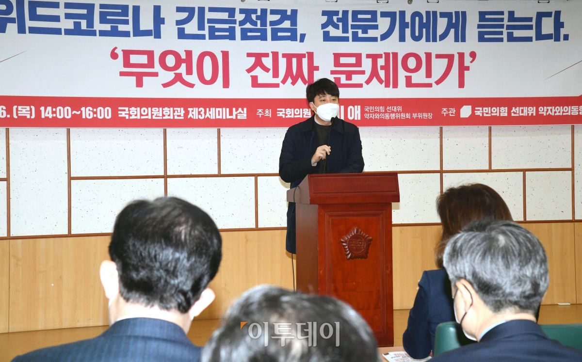 16일 국회의원회관에서 열린 '위드 코로나 긴급 점검 전문가에게 듣는다 무엇이 진짜 문제인가' 토론회에서 이준석 국민의힘 대표가 축사를 하고 있다.