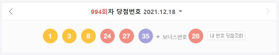 로또복권 운영사 동행복권이 제994회 로또복권 추첨에서 '1, 3, 8, 24, 27, 35'가 1등 당첨번호로 뽑혔다고 18일 밝혔다. 2등 보너스 번호는 '28'이다.