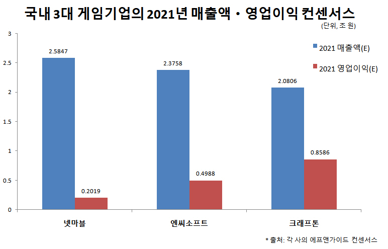 19일 금융정보 제공 업체 에프앤가이드에 따르면 크래프톤의 올해 전체 매출액 컨센서스는 2조806억 원으로 집계됐다. 이는 넷마블(2조5847억 원), 엔씨소프트(2조3758억 원)보다 각각 5041억 원, 2952억 원 뒤처지는 수치다.