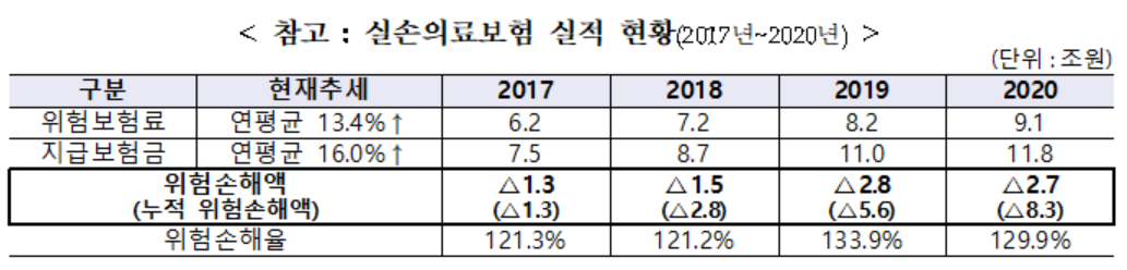 보험사들은 올해 실손보험의 손실액만 3조6000억 원에 달할 것으로 보고 있다. 보험사들은 특히 본인부담금이 거의 없어 적자 폭이 큰 1세대 상품과 2세대 실손보험료는 법정 상한선인 25%까지 인상해야 한다고 주장한다. 한 보험사 관계자는 "올해 손실액을 계산해보고 업계가 모두 놀랐다"며 "실손은 물론 다른 보험상품 가입자에게까지 피해가 전가될 수 있다. 망할 수도 있다는 위기감이 있다"고 말했다. 올해 실손보험료 인상 폭은 회사·상품별로 평균 11.9~19.6% 수준이었다.