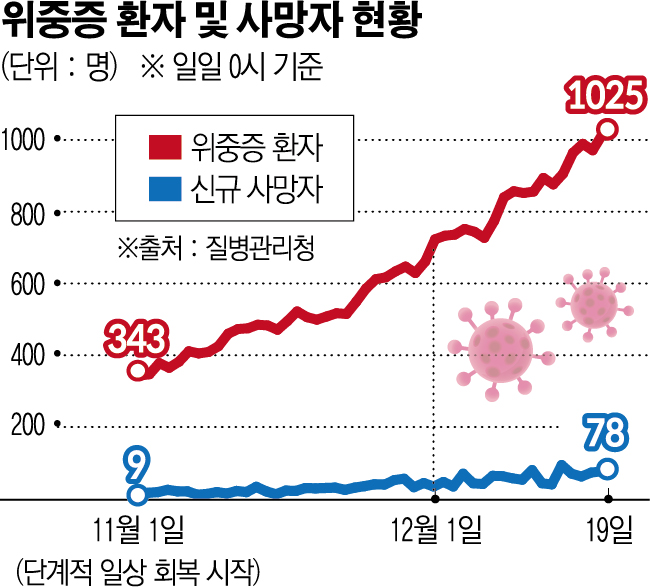 코로나19 위중증 환자 수가 연일 1000명대로 집계되면서 중증병상 가동률은 한계치에 다다르고 있다.