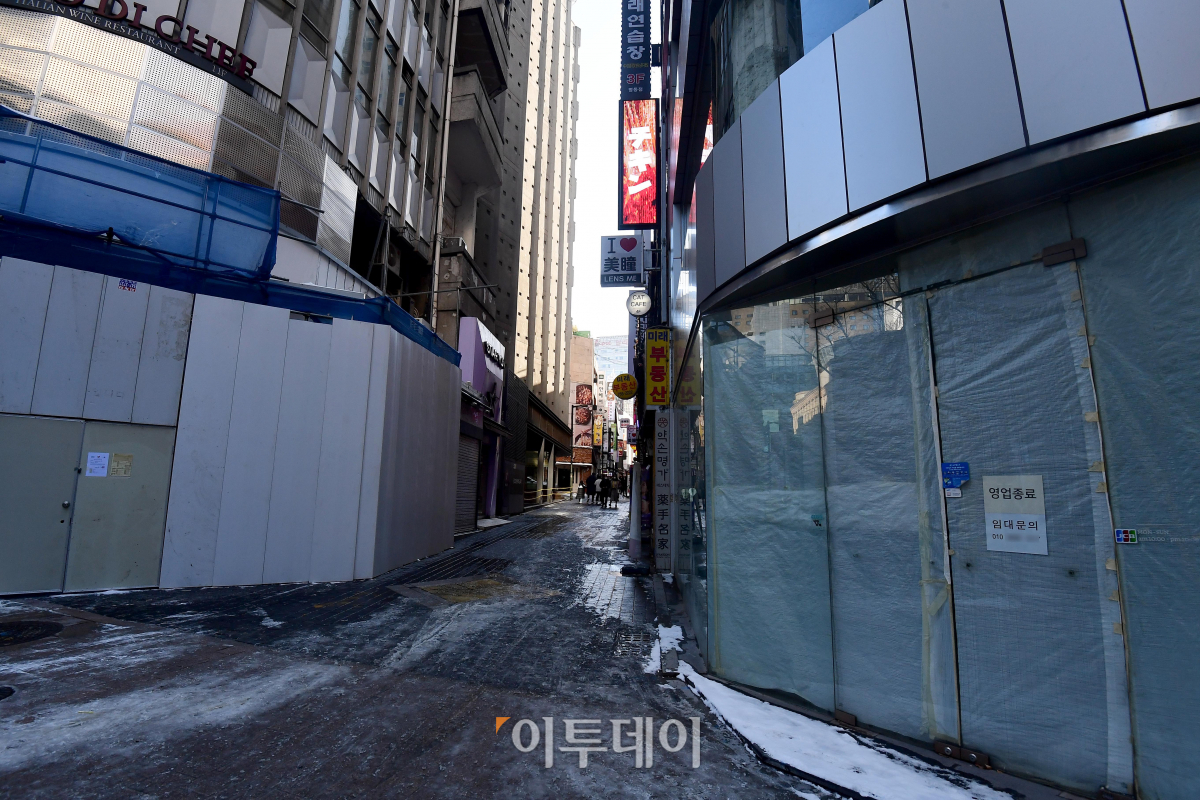 강화된 사회적 거리두기 조치 시행으로 ‘연말 특수’를 기대했던 자영업자들의 한숨이 깊어지고 있다. 거리두기 시행 후 첫 주말인 19일 서울 명동 거리가 썰렁하다.