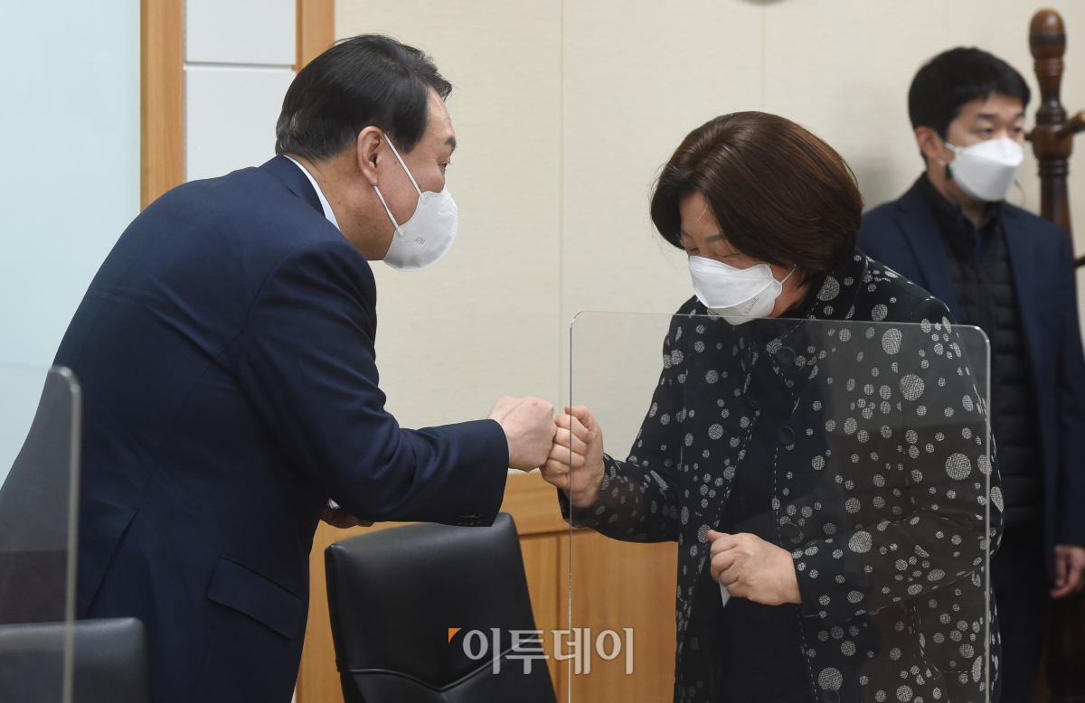윤석열 국민의힘 대선 후보가 21일 오후 서울 강남구 한국과학기술회관에서 열린 한국과학기술단체총연합회 간담회에서 참석자들과 인사를 나누고 있다. 국회사진취재단