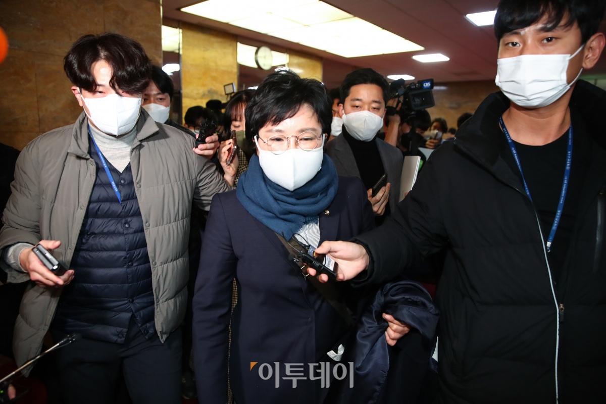 조수진 국민의힘 의원이 21일 오후 서울 여의도 국회 국민의힘 당대표실에서 이준석 대표와 만나지 못하고 발걸음을 돌리고 있다.