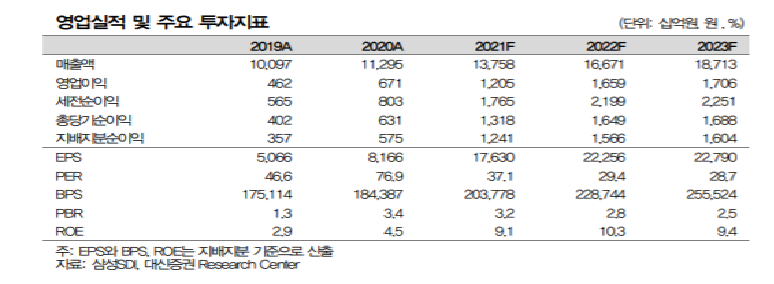대신증권은 22일 삼성SDI에 대해 투자의견 '매수'와 목표주가 92만 원을 제시했다.