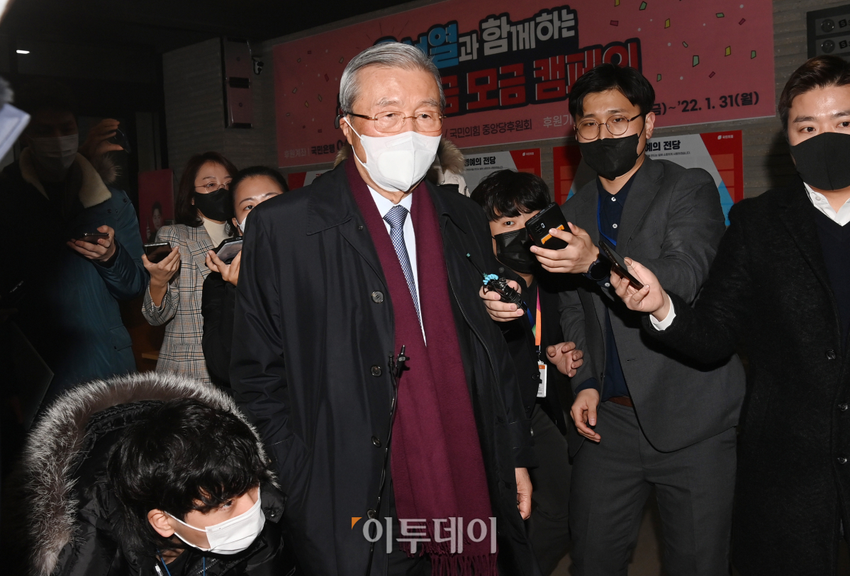김종인 국민의힘 총괄선거대책위원장이 22일 오전 서울 영등포구 국민의힘 당사로 출근하고 있다.