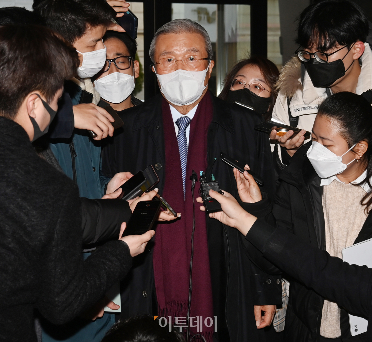 김종인 국민의힘 총괄선거대책위원장이 22일 오전 서울 영등포구 국민의힘 당사로 출근하며 기자들의 질문에 답하고 있다.