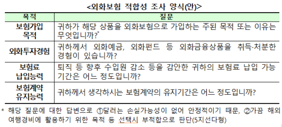 실수요자 중심 판매를 유도하기 위해 적합성 조사 시 실수요 여부를 충실히 확인하고, 소비자가 '환위험'을 명확히 인지할 수 있도록 환율변동(±10~50%)시 보험료·보험금·해지환급금을 수치화해 가입할 때와 유지기간 중 매분기 상세히 설명해야 한다.
