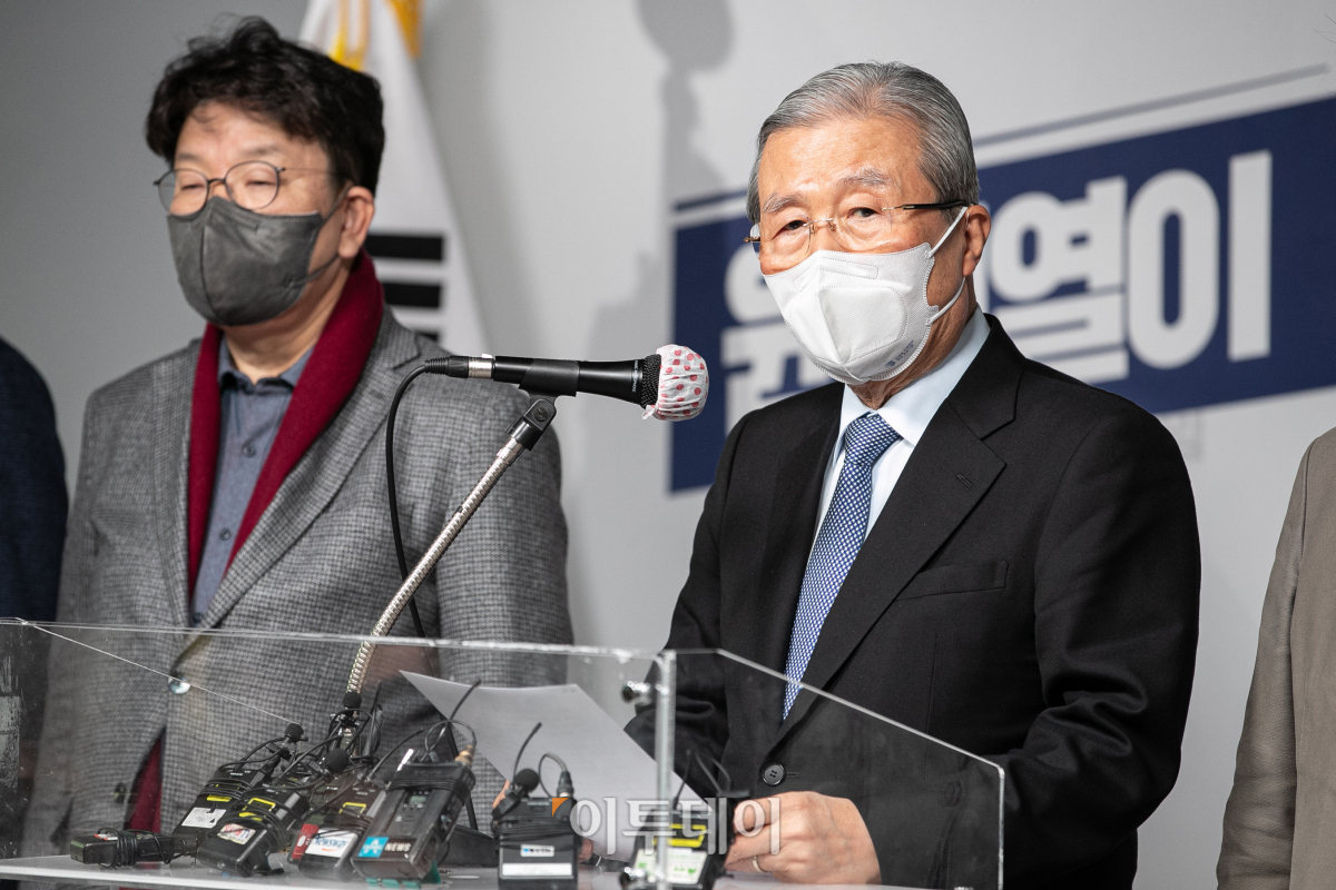김종인 국민의힘 총괄선대위원장이 22일 오후 서울 여의도 국민의힘 당사에서 대장동 사건 특검 촉구 긴급 기자회견을 하고 있다.