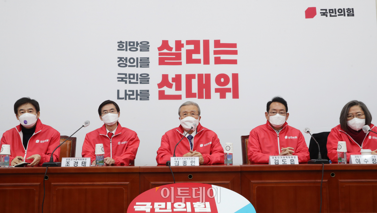 국민의힘 김종인 총괄선대위원장이 23일 오전 국회에서 열린 중앙선거대책위원회의에서 발언하고 있다.