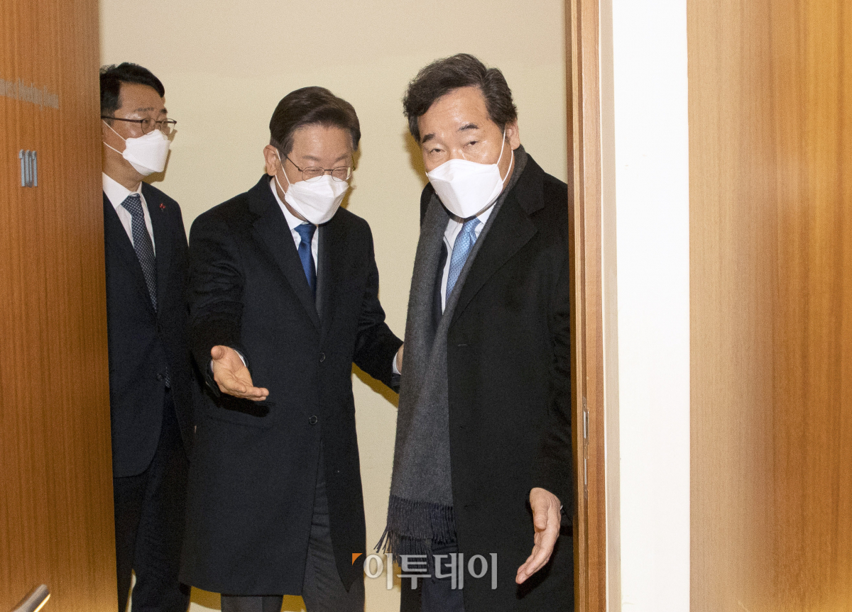 이재명 더불어민주당 대선후보와 이낙연 전 민주당 대표가 23일 오찬 회동을 위해 서울 중구의 한 식당으로 들어서고 있다. 국회사진취재단