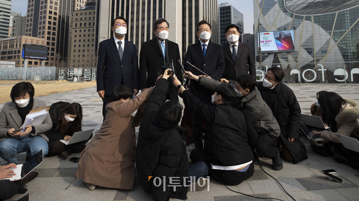 더불어민주당 이재명 대선후보(왼쪽 두번째)와 이낙연 전 더불어민주당 대표가 윤영찬 의원(왼쪽 끝)과 오영훈 의원(오른쪽 끝)이 배석한 가운데 23일 정오 서울 중구 달개비에서 오찬 회동을 마치고 서울도시건축관으로 이동해 이번 회동에 대한 결과를 발표하고 있다. 국회사진취재단