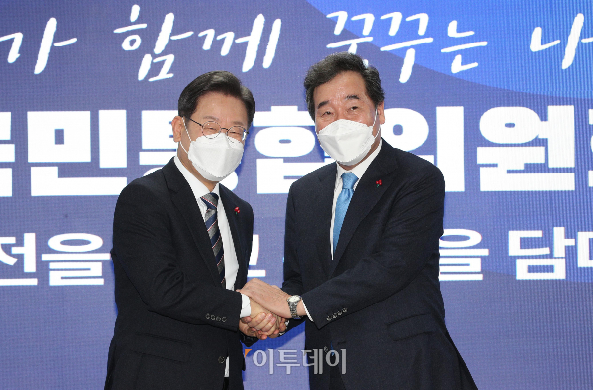 이재명 더불어민주당 대선후보(왼쪽)와 이낙연 공동위원장이 27일 오전 서울 여의도 당사에서 열린 국가비전·국민통합위원회 출범식에 앞서 손을 잡고 있다.