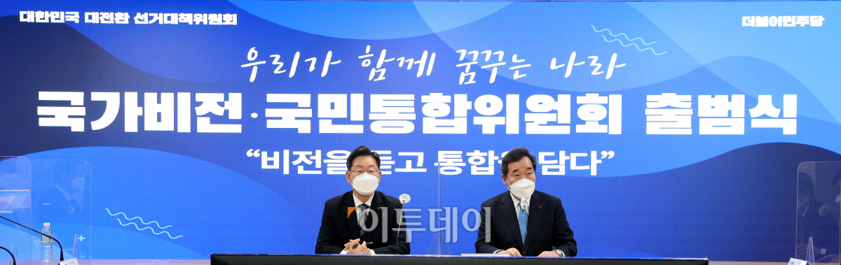 이재명 더불어민주당 대선후보(왼쪽)와 이낙연 공동위원장이 27일 오전 서울 여의도 당사에서 열린 국가비전·국민통합위원회 출범식에 참석하고 있다.