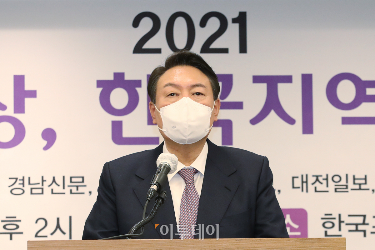 윤석열 국민의힘 대선 후보가 27일 오후 서울 중구 프레스센터에서 한국지방신문협회 주최로 열린 지방자치대상 및 한국지역발전대상 시상식에 참석해 축사를 하고 있다. 국회사진취재단