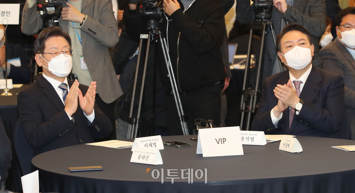 이재명 더불어민주당 대선 후보와 윤석열 국민의힘 대선 후보가 27일 오후 서울 중구 프레스센터에서 한국지방신문협회 주최로 열린 지방자치대상 및 한국지역발전대상 시상식에 참석해 자리하고 있다. 국회사진취재단