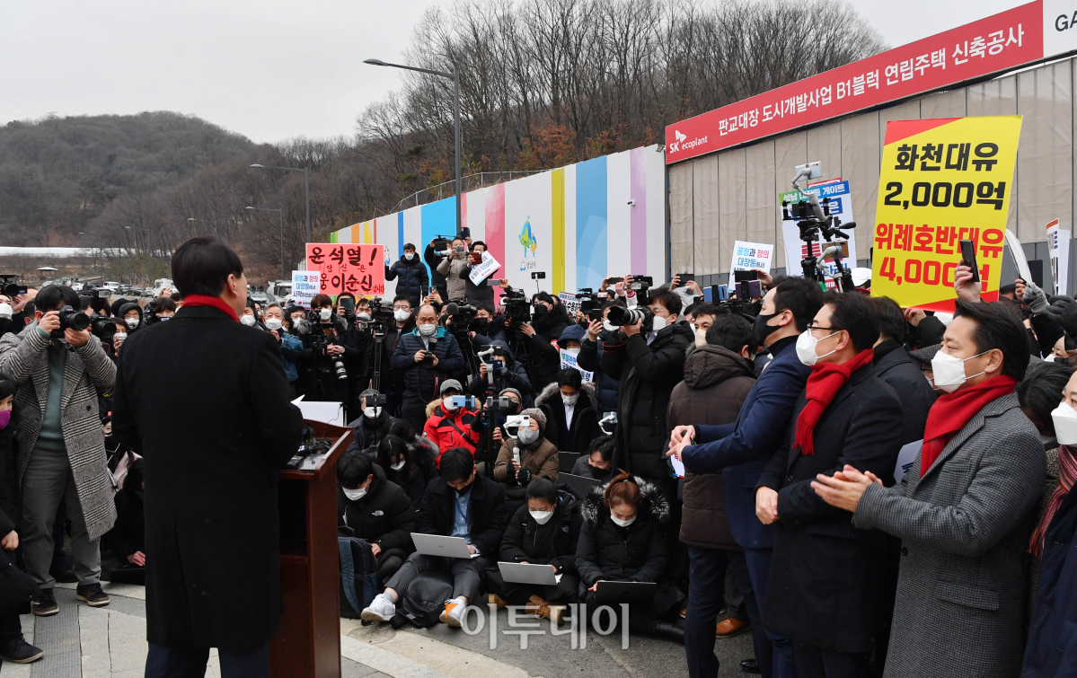 윤석열 국민의힘 대선 후보가 27일 오후 경기 성남 대장동 현장을 방문해 더불어민주당 이재명 대선 후보 등에 대한 특검 수사를 촉구하는 기자회견을 갖고 있다. 국회사진취재단