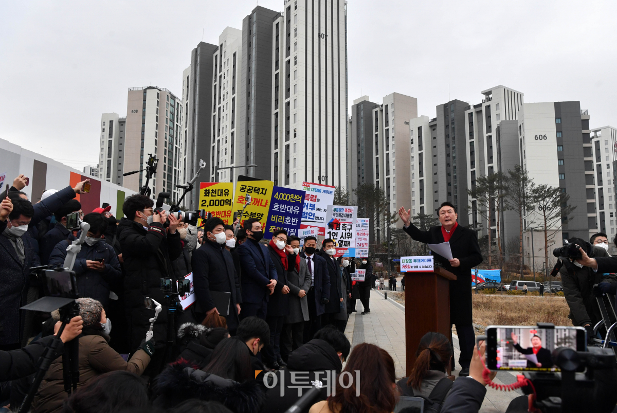 윤석열 국민의힘 대선 후보가 27일 오후 경기 성남 대장동 현장을 방문해 더불어민주당 이재명 대선 후보 등에 대한 특검 수사를 촉구하는 기자회견을 갖고 있다. 국회사진취재단