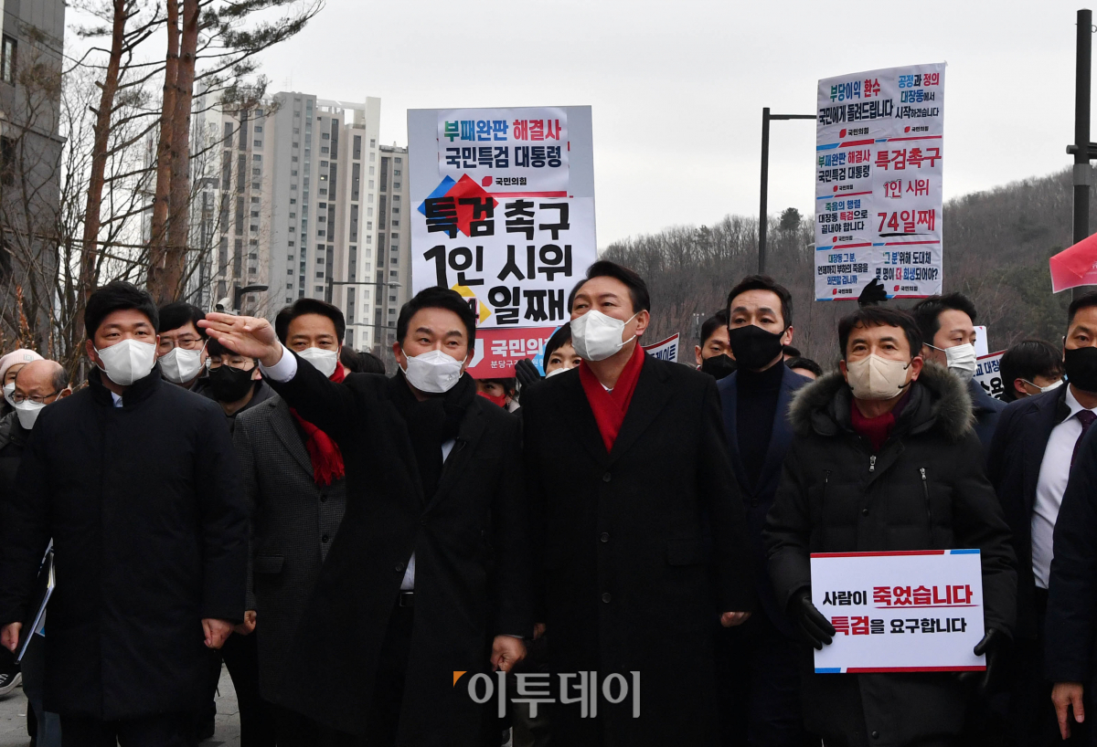 윤석열 국민의힘 대선 후보가 27일 오후 경기 성남 대장동 현장을 방문해 더불어민주당 이재명 대선 후보 등에 대한 특검 수사를 촉구하는 기자회견을 가진 뒤 아파트단지를 걷고 있다. 국회사진취재단