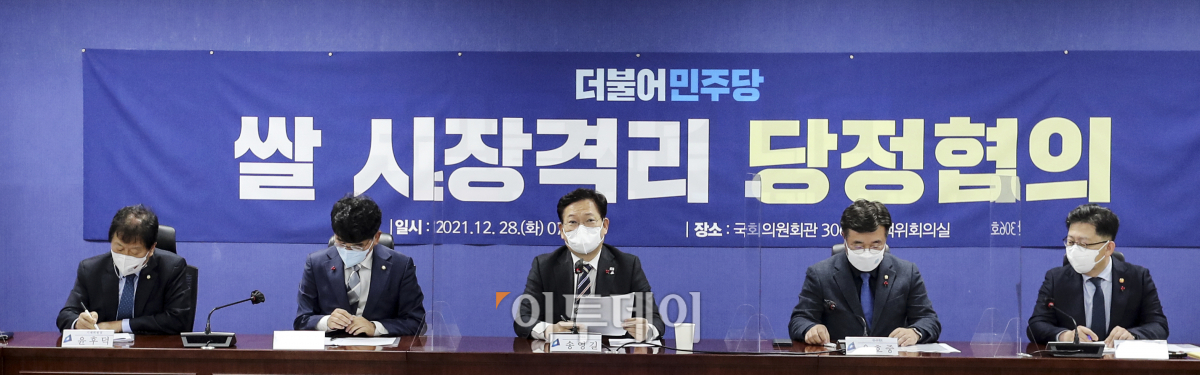 송영길 더불어민주당 대표가 28일 오전 서울 여의도 국회 의원회관에서 열린 쌀 시장 격리 당정협의에서 모두발언하고 있다. 왼쪽부터 윤후덕 의원, 박완주 정책위의장, 송 대표, 윤호중 원내대표, 김현수 농림축산식품부 장관.