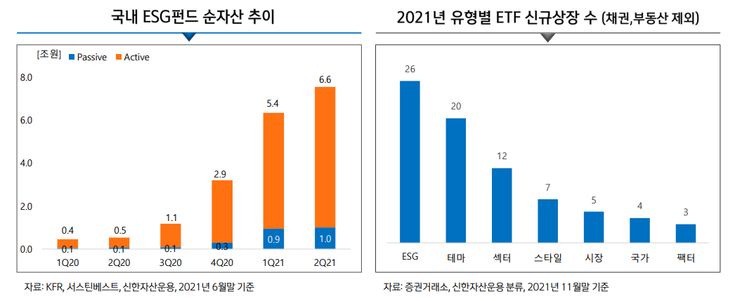ETF 유형별로 살펴봐도 ESG 관련 종목이 26개로 테마(20개), 섹터(12개), 스타일(7개) 등을 크게 앞질렀다.