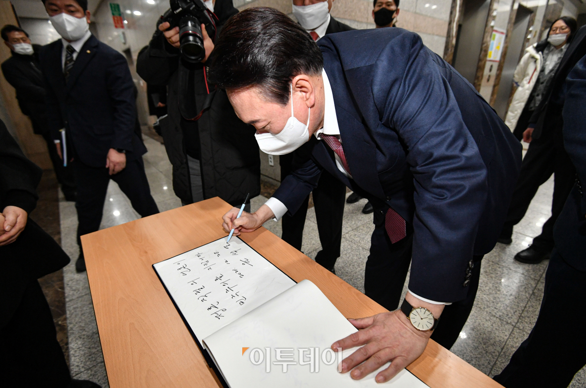 윤석열 국민의힘 대선 후보가 28일 서울 양천구 한국방송회관에서 열린 한국방송기자클럽 초청 토론회에 앞서 방명록을 작성하고 있다. 국회사진취재단