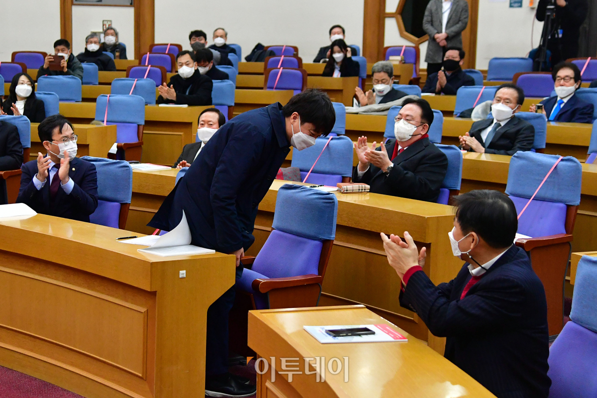 국민의힘 이준석 대표가 28일 국회 의원회관에서 열린 지역균형발전 모색 정책토론회에 참석해 인사를 하고 있다.