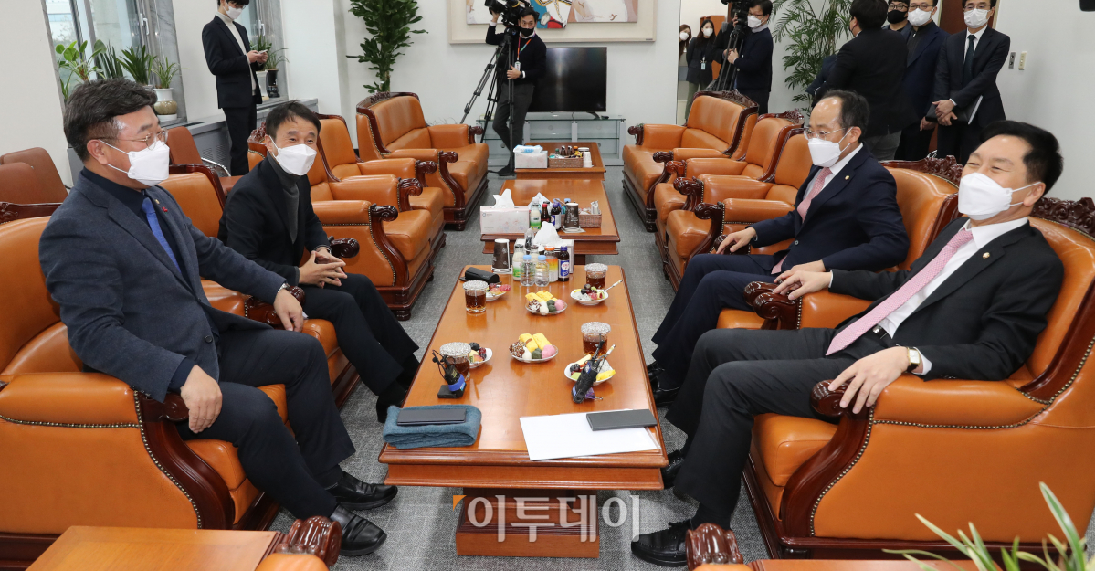 더불어민주당 윤호중 원내대표와 국민의힘 김기현 원내대표가 28일 서울 여의도 국회 운영위원장실에서 여야교섭단체 원내대표 회동을 하고 있다. 왼쪽부터 더불어민주당 윤호중 원내대표, 한병도 원내수석부대표, 국민의힘 추경호 원내수석부대표, 김기현 원내대표.