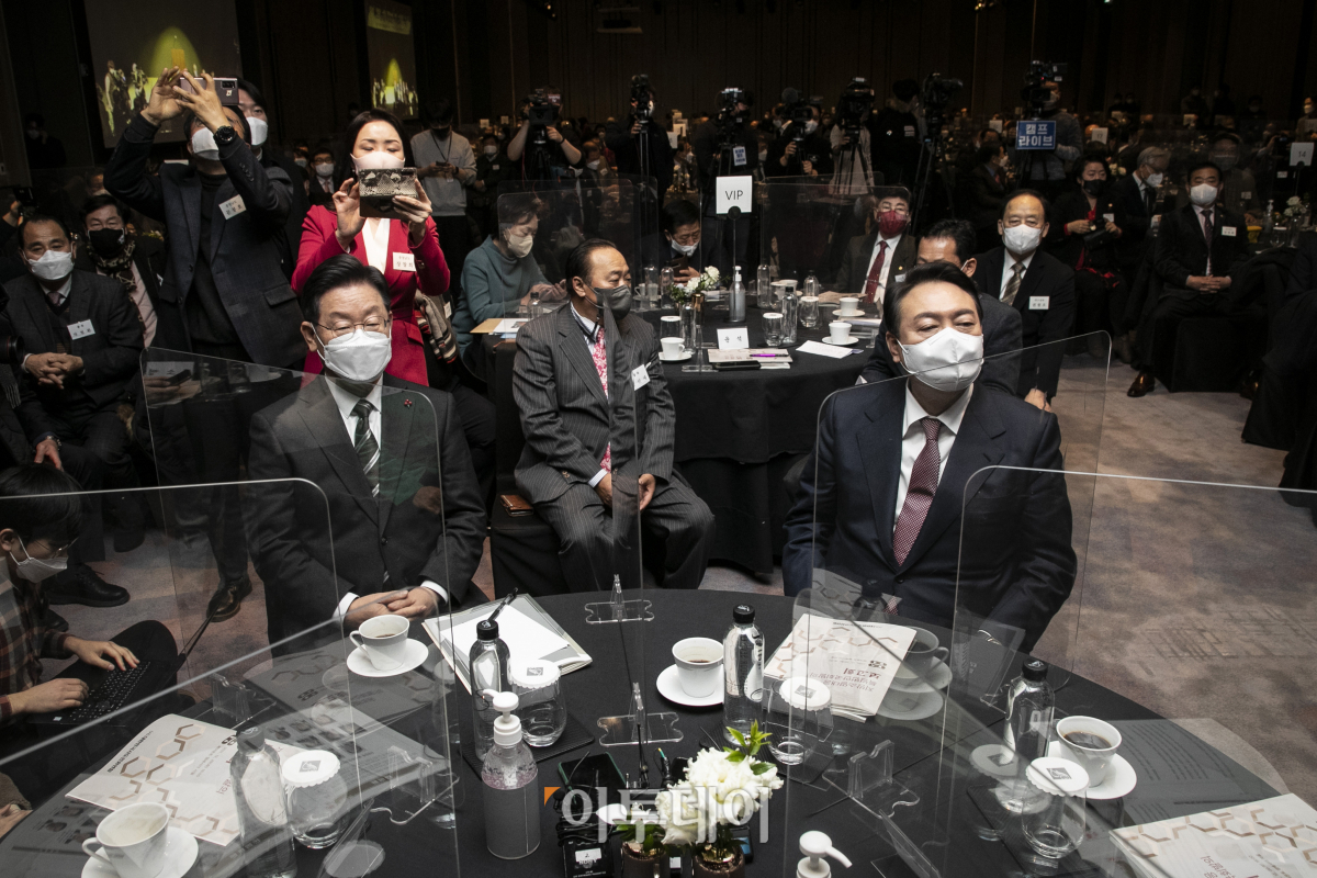 (왼쪽) 이재명 더불어민주당 대선후보와 (오른쪽) 윤석열 국민의힘 대선후보가 28일 오후 페어몬트 엠버서더 서울 그랜드 볼룸에서 열린 ‘국가 균형 발전을 위한 지방 소멸 대응 특별 법안 국회발의 간담회’에 참석해있다.