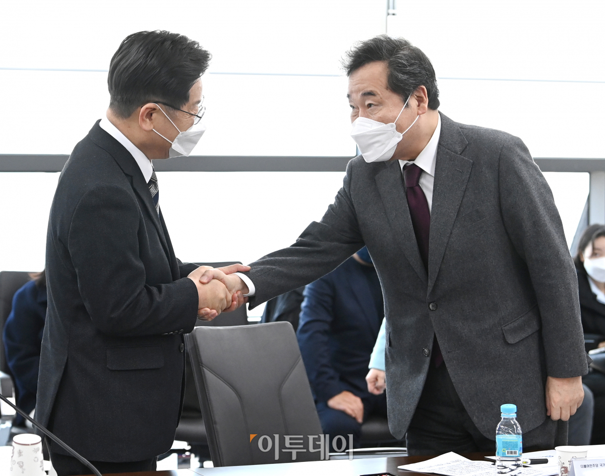 이재명 더불어민주당 대선후보와 이낙연 국가비전·국민통합위원회 공동위원장이 29일 서울 광진구 보건복지행정타운의 한국사회보장정보원을 방문해 악수하고 있다. 국회사진취재단