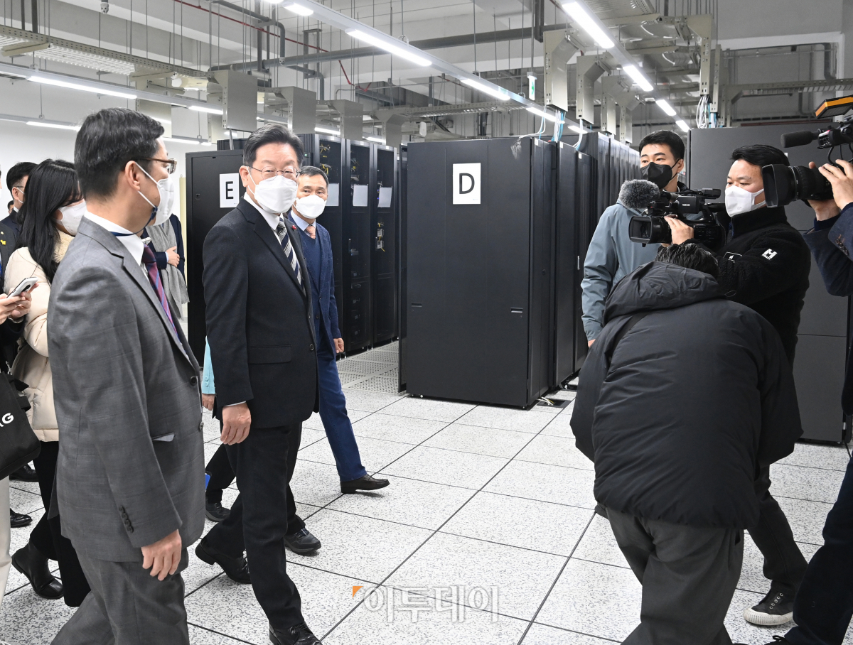 이재명 더불어민주당 대선후보가 29일 서울 광진구 보건복지행정타운의 한국사회보장정보원을 방문해 전산장비실을 둘러보고 있다. 국회사진취재단