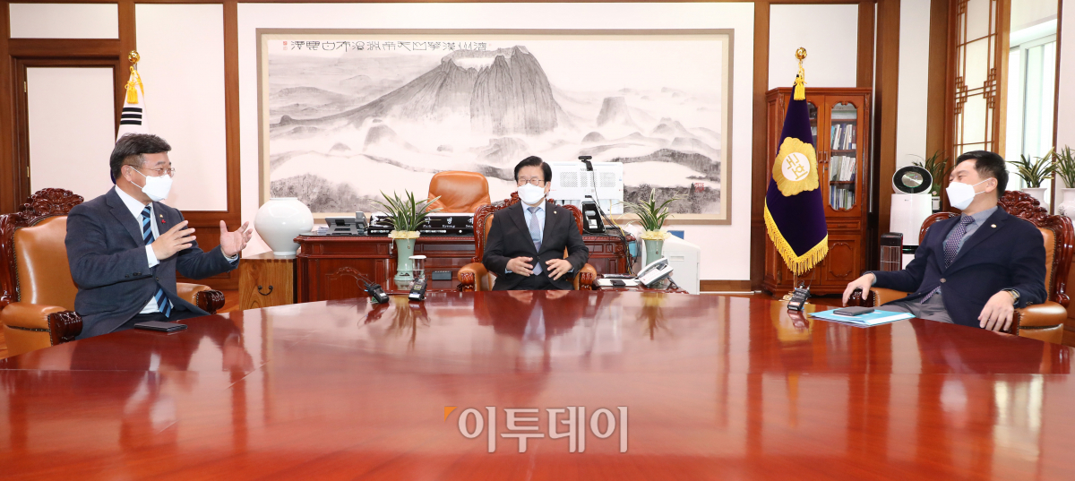 박병석 국회의장(가운데)과 윤호중 더불어민주당 원내대표(왼쪽), 김기현 국민의힘 원내대표가 29일 오후 국회 의장실에서 본회의 일정 논의를 위해 회동을 갖고 있다.