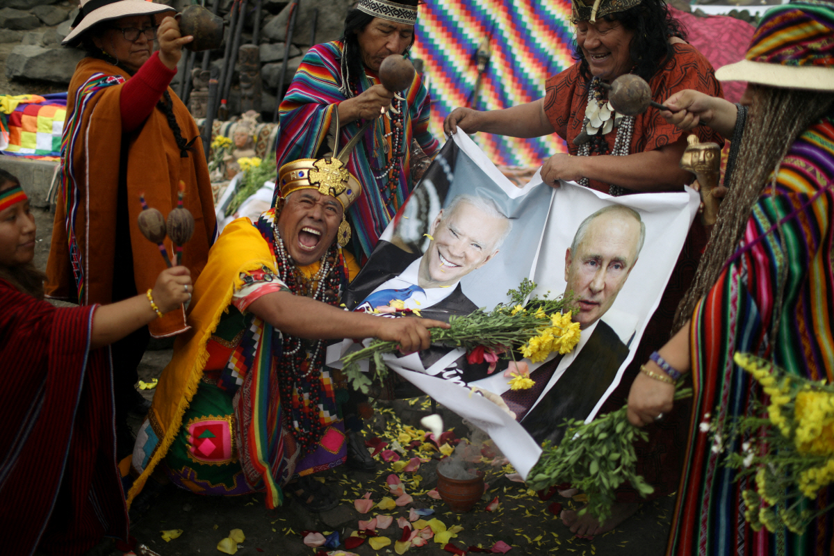 페루 무당들이 29일(현지시간) 리마 산크리스토발 언덕에서 새해 전 세계 운세를 점치는 전통 의식에서 조 바이든 미국 대통령과 블라디미르 푸틴 러시아 대통령 사진을 들고 그들의 운명을 예언하고 있다. 무당들은 이날 “모든 국가에 매우 유리한 해가 될 것이다. 사람들의 건강이 매우 좋아지고 갈등이 줄어들 것”이라며 “경제가 큰 충격을 받아왔지만, 우리는 벗어날 것”이라고 내다봤다. 이들은 신종 코로나바이러스 감염증(코로나19) 종식과 페루의 2022년 카타르 월드컵 통과도 기원했다. 리마/로이터연합뉴스