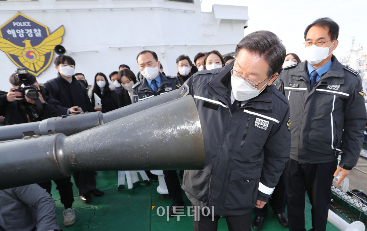 이재명 더불어민주당 대선후보가 30일 인천해양경찰서 전용부두에 위치한 서해5도 특별경비단을 방문해 경비함의 함포를 살펴보고 있다.