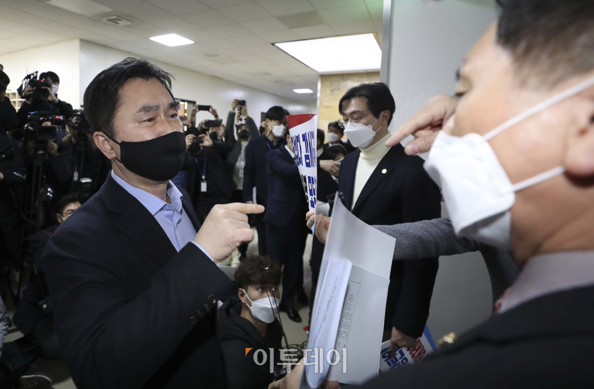 김종민 더불어민주당 의원이 30일 서울 국회 법제사법위원회 회의장 앞에서 의원총회를 하고 있는 국민의힘 의원들 앞에서 김진욱 고위공직자범죄수사처(공수처) 처장이 발언을 하자 김기현 국민의힘 원내대표에게 항의하고 있다.