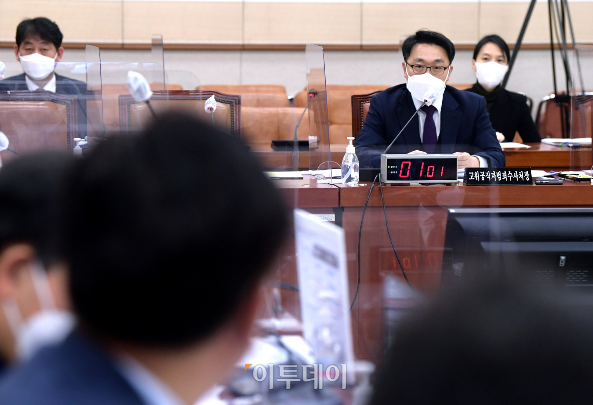 김진욱 공위공직자범죄수사처장이 30일 오후 서울 여의도 국회에서 열린 법제사법위원회 전체회의에서 공수처의 야당 대선 후보 및 국회의원 등의 통신기록 조회 논란에 대한 현안 질의에 답하고 있다.
