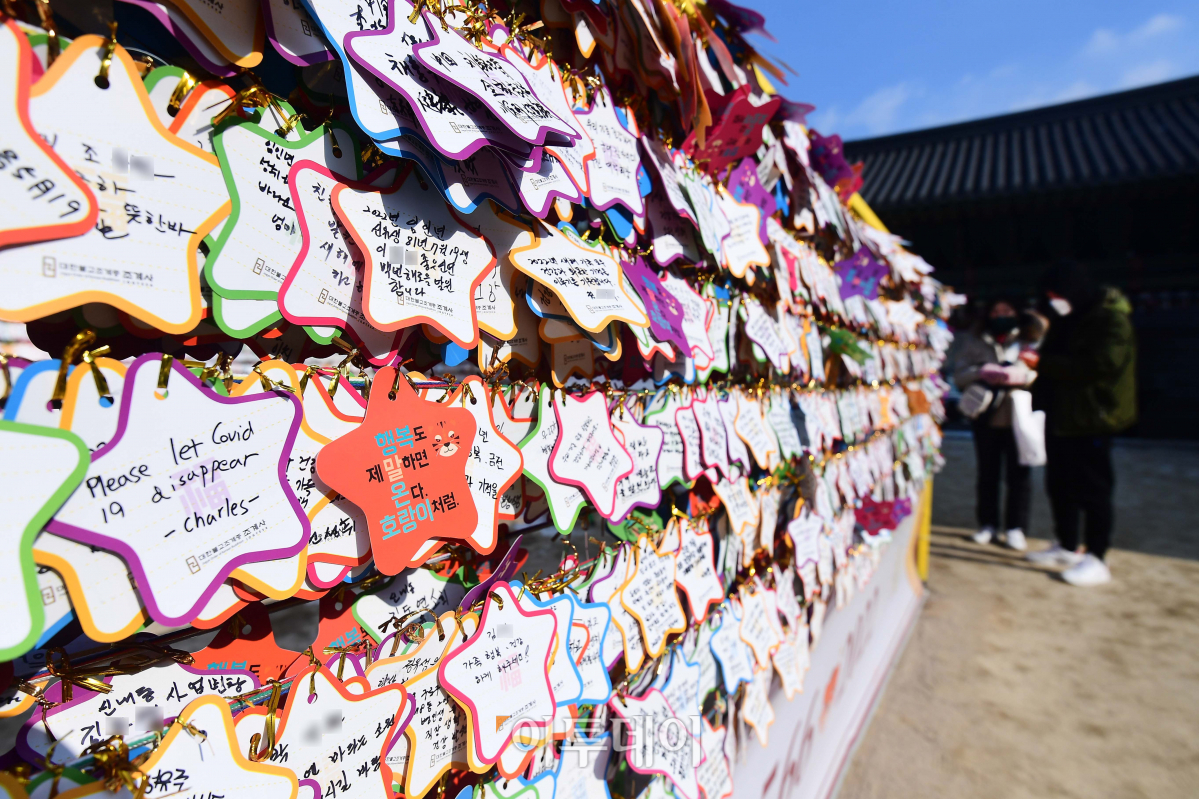 임인년(壬寅年) 새해 첫 주말인 2일 서울 종로구 조계사에서 시민들이 소원의 탑에 새해 소망을 적은 메모지를 달고 있다.