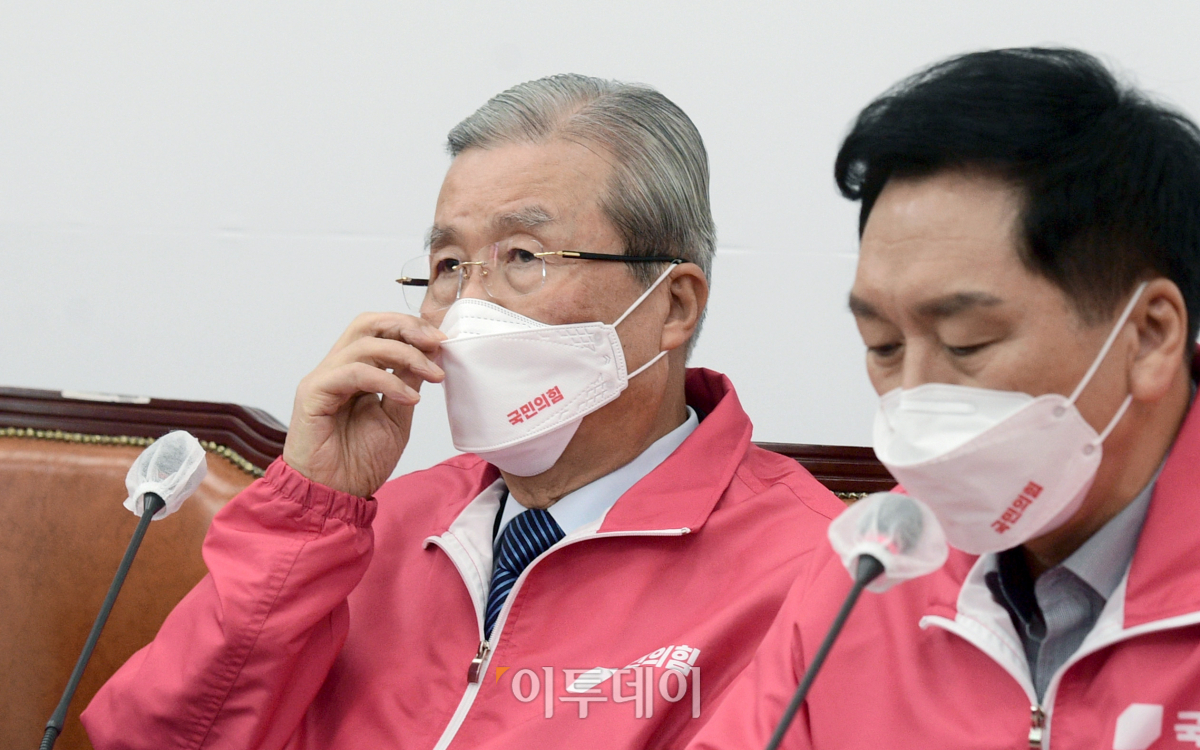 김종인 국민의힘 총괄선대위원장이 3일 국회에서 열린 중앙선거대책위원회의에 참석, 회의 도중 마스크를 바로쓰고 있다.