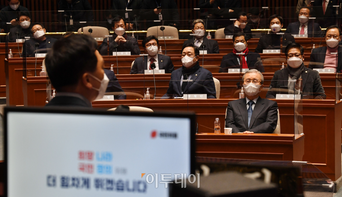 국민의힘 김종인 총괄선대위원장과 의원들이 3일 서울 여의도 국회에서 열린 '변화와 단결' 의원총회에서 김기현 원내대표의 발언을 듣고 있다.