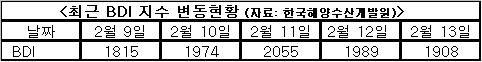 16일 해운업계와 한국해양수산개발원에 따르면 해운업황을 대표적으로 나타내는 지수인 BDI가 지난 11일 2055포인트를 기록한 이후, 12일과 13일 이틀 연속 하향세를 기록하면서 1908로 내려앉았다.