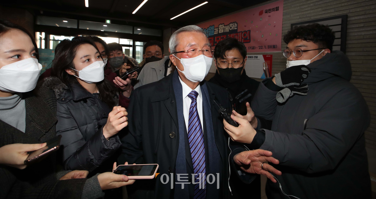 김종인 국민의힘 총괄선대위원장이 4일 서울 여의도 국민의힘 당사로 들어서고 있다.