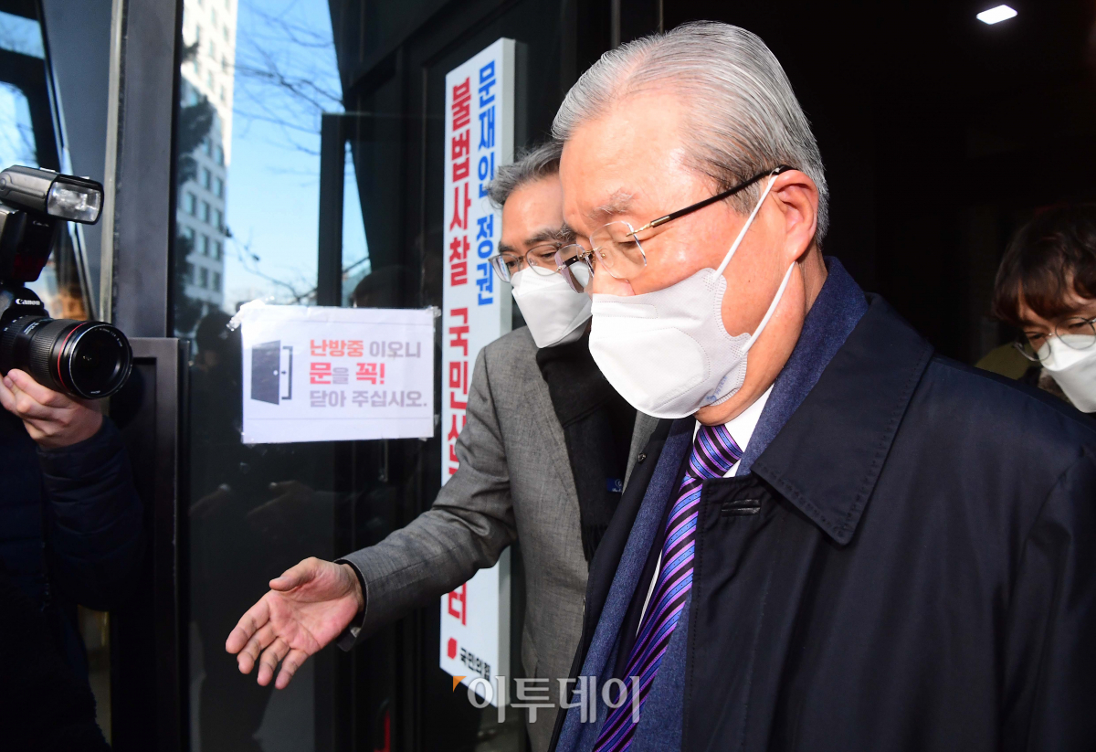김종인 국민의힘 총괄선대위원장이 4일 서울 여의도 국민의힘 중앙당사에서 나서고 있다.