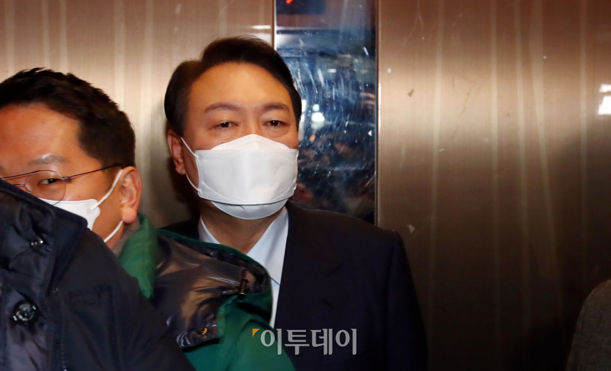 국민의힘 윤석열 대선 후보가 선대위 관련 기자회견을 하기 위해 5일 오전 서울 영등포구 국민의힘 당사로 들어가고 있다.