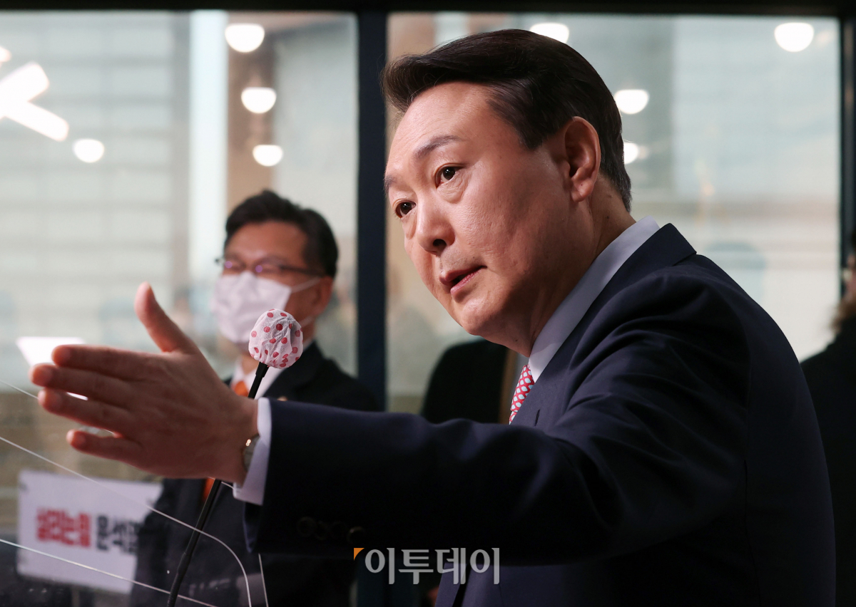 국민의힘 윤석열 대선 후보가 5일 오전 서울 영등포구 국민의힘 당사 브리핑룸에서 선대위 관련 기자회견을 하고 있다.