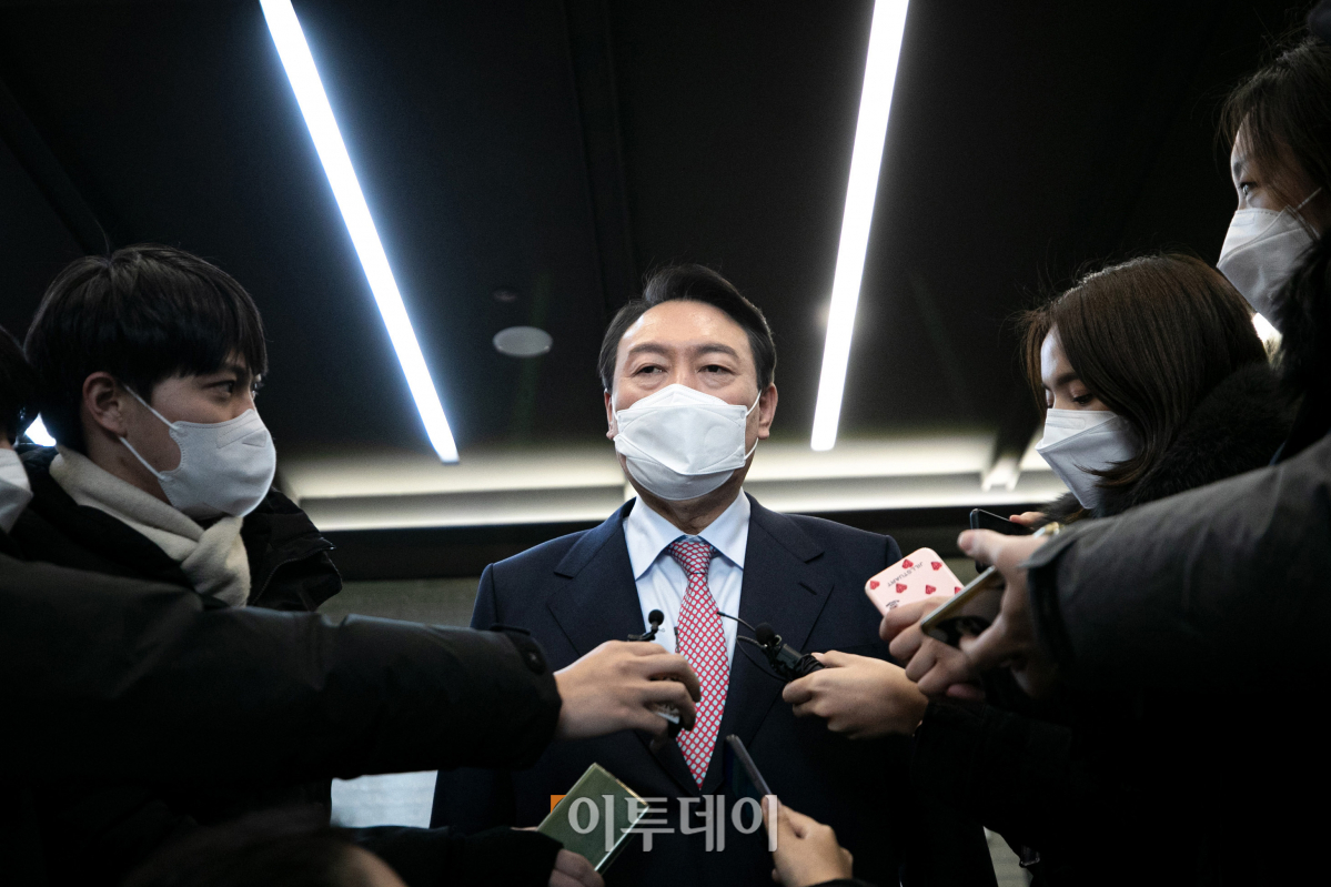 윤석열 국민의힘 대선 후보가 5일 오전 서울 영등포구 국민의힘 당사 브리핑룸에서 선대위 관련 기자회견을 마친 후 오후 일정을 위해 당사를 나오며 기자들의 질문을 받고있다.
