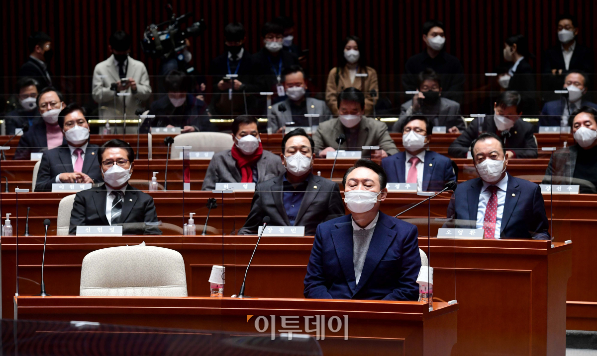 윤석열 국민의힘 대선후보가 6일 서울 여의도 국회에서 열린 국민의힘 ‘변화와 단결’ 의원총회에서 잠시 생각에 잠겨 있다. 왼쪽은 총회에 불참한 이준석 대표의 자리.
