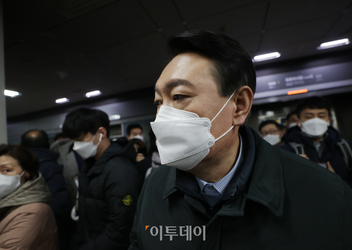 윤석열 국민의힘 대선 후보가 7일 오전 서울 지하철 9호선을 타고 여의도 국회의사당역에서 내려 당사로 출근하고 있다.