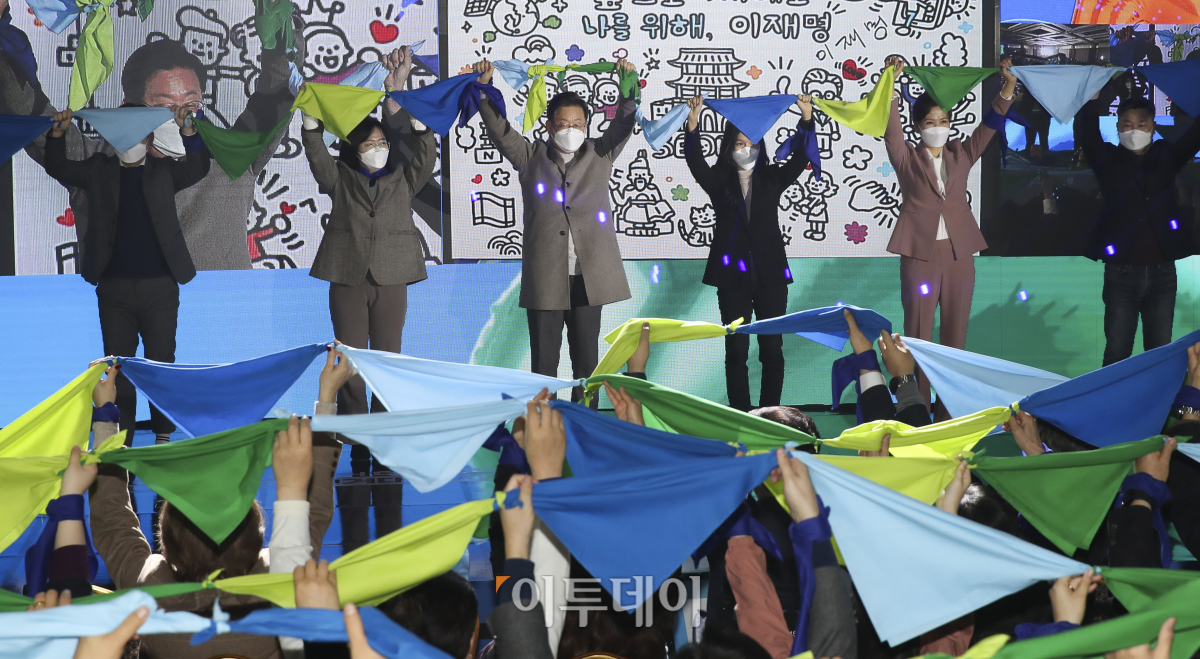 7일 용산구 백범김구기념관에서 열린 더불어 민주당 서울시 선대위 출범식에 참석한 이재명후보가 약속매듭 퍼포먼스를 하고 있다. 국회사진취재단