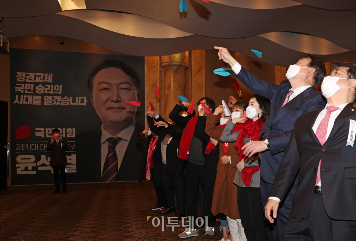 국민의힘 윤석열 대선 후보가 10일 오전 인천 연수구 송도센트럴파크호텔에서 열린 인천시 선거대책위원회 출범식에서 참석자들과 함께 종이비행기를 날리고 있다. 국회사진취재단