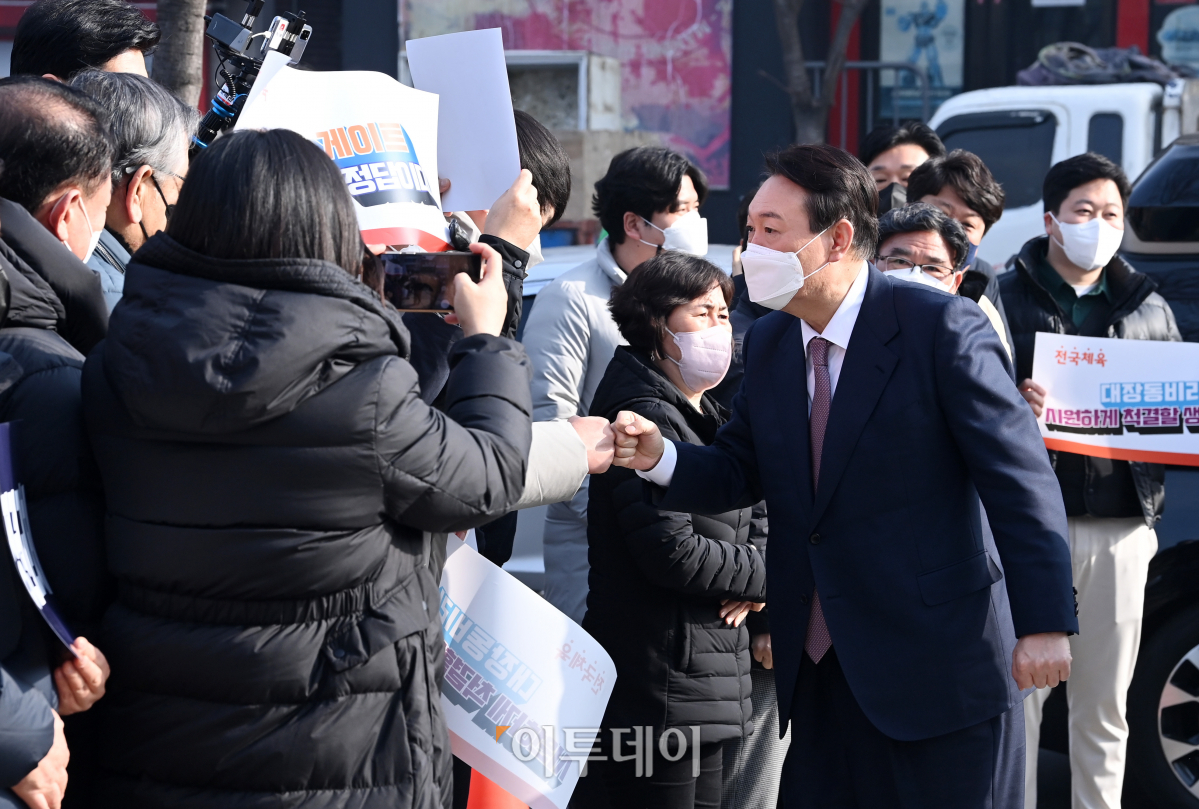 윤석열 국민의힘 대선 후보가 10일 오전 인천역 앞 광장에서 산업화·교역일번지 인천지역 공약 발표에 앞서 시민들과 인사를 하고 있다. 국회사진취재단